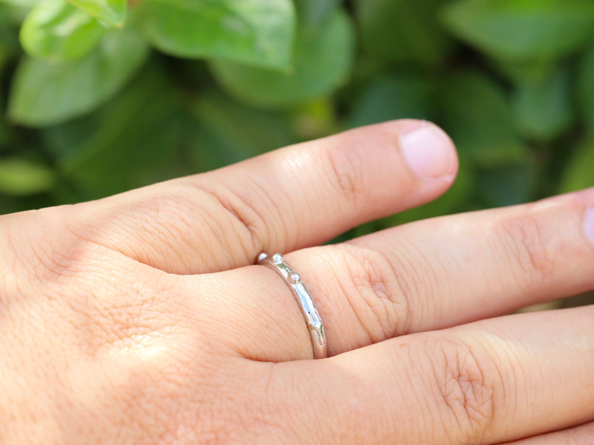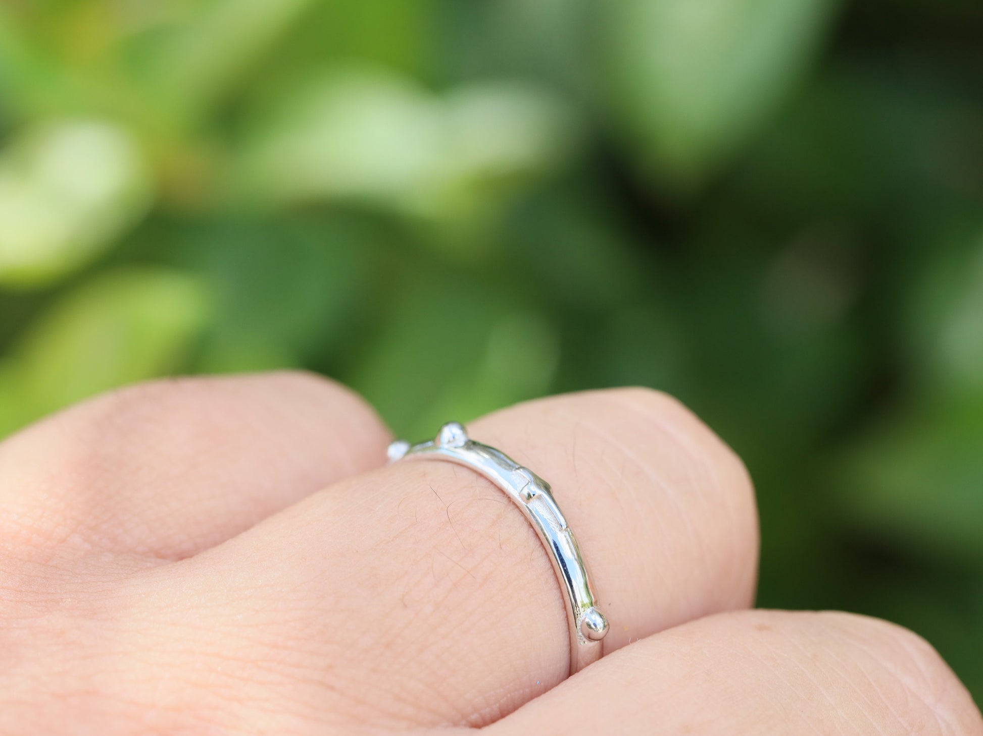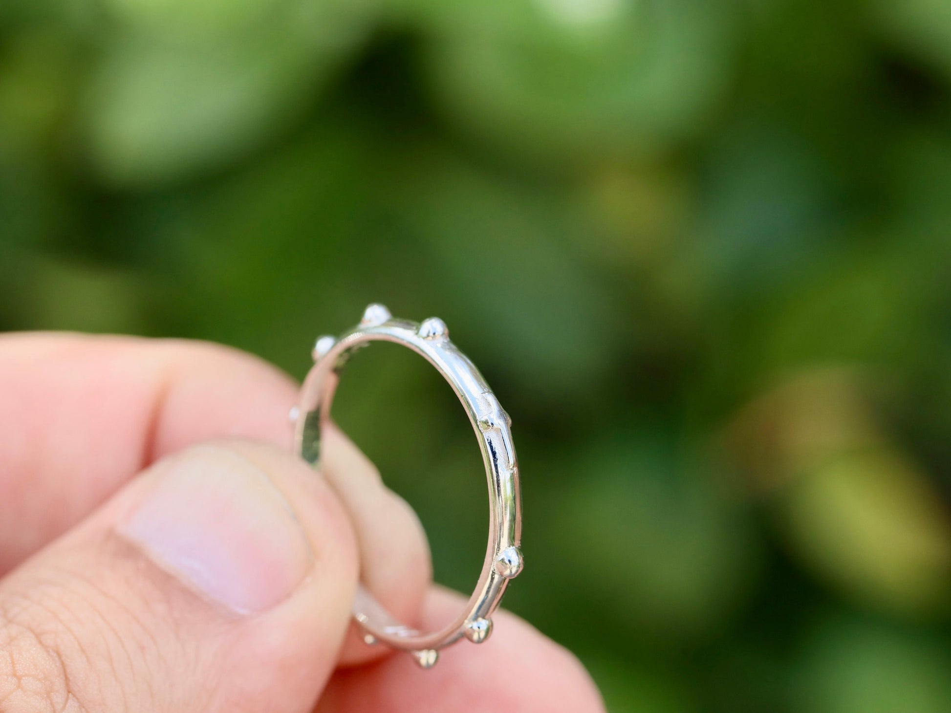 Ring is minimalist style with dainty cross in middle surrounded with 10 silver beads as it is possible to be seen on photos.