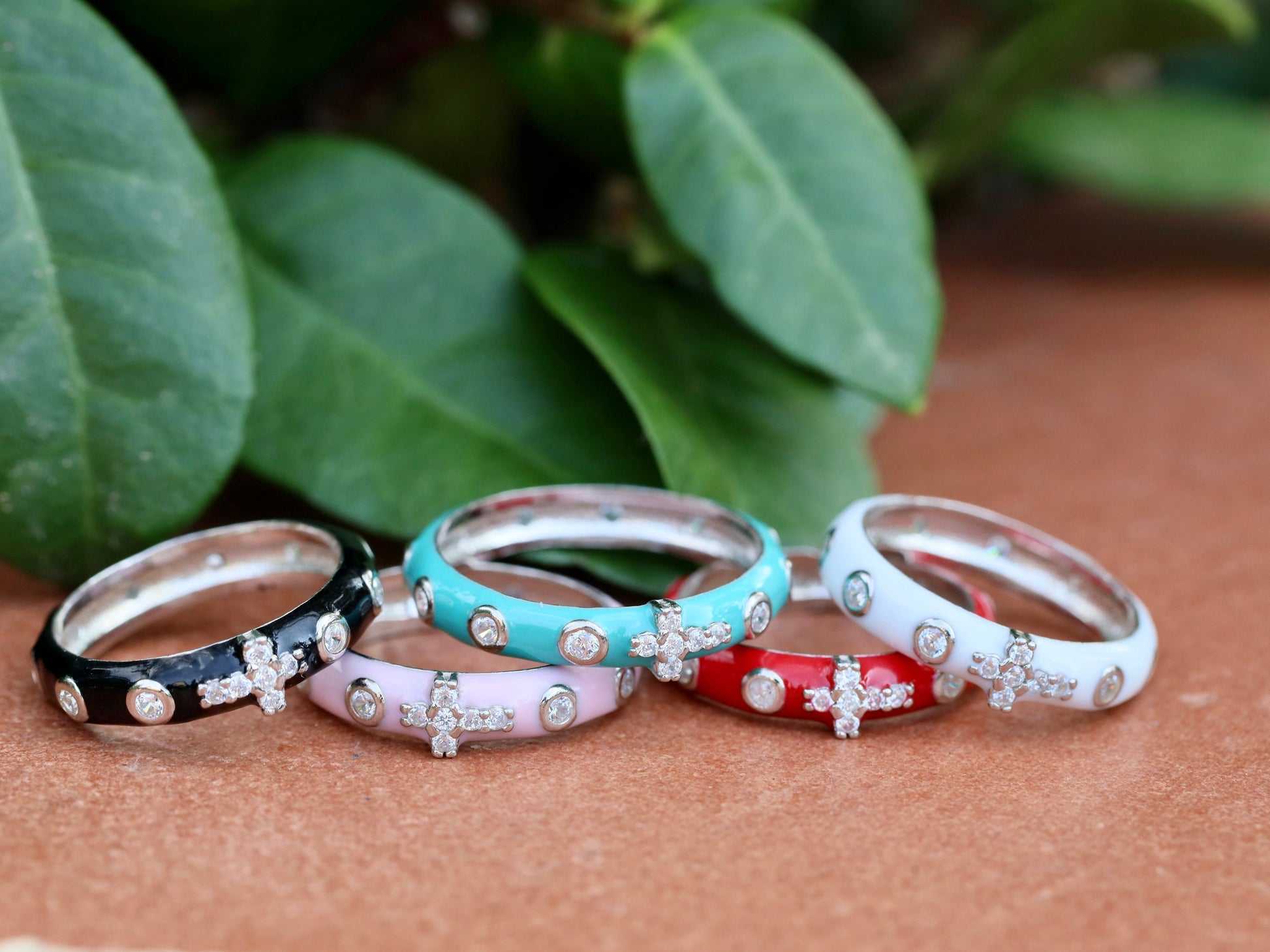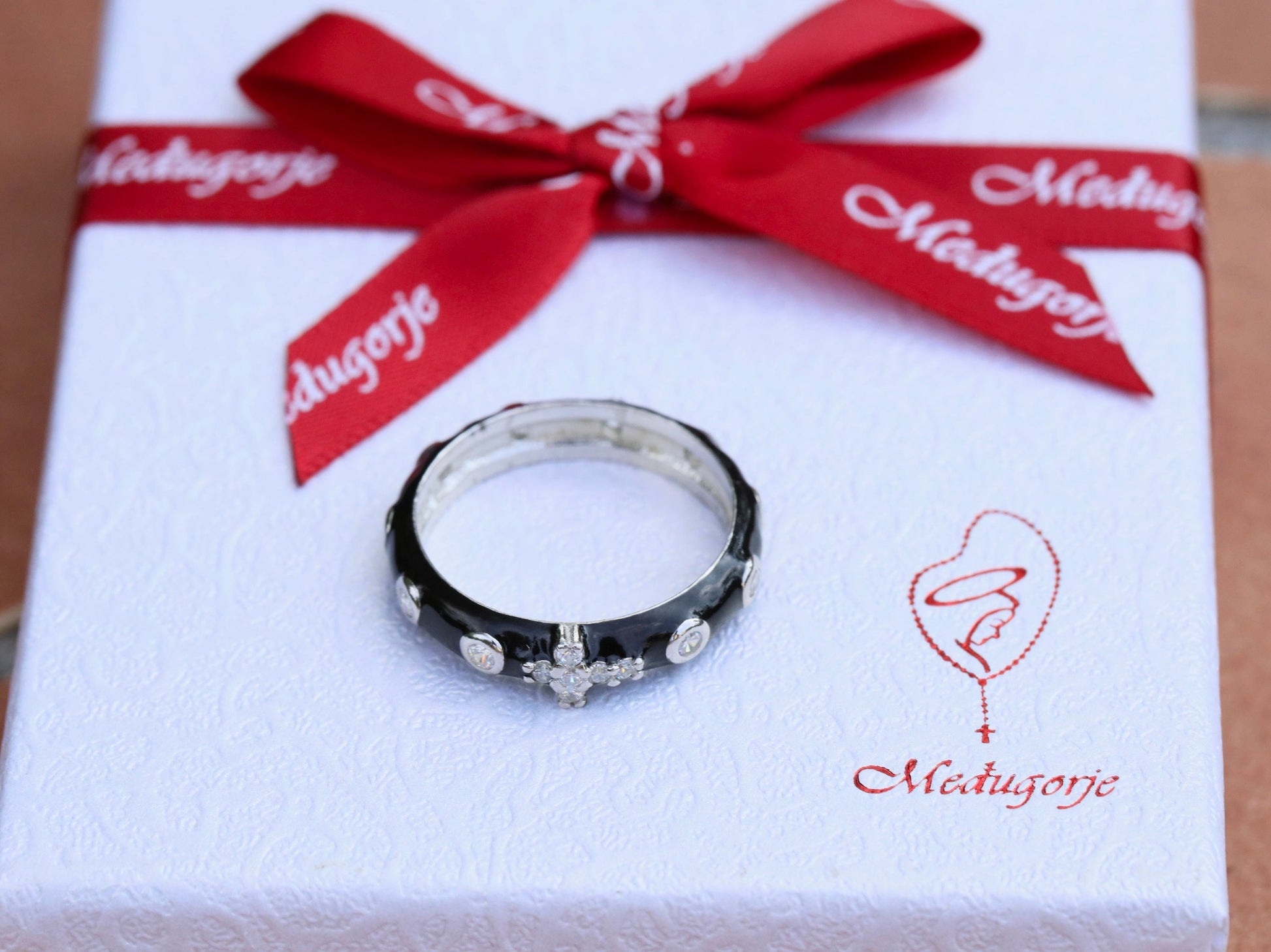 Rosenkranzring, Sterlingsilber 925 Rosenkranzring, Ring für Teenager, Geschenk für sie, Zirkonium-Rosenkranzring, zierlicher schwarzer Emaille-Ring mit Kreuz
