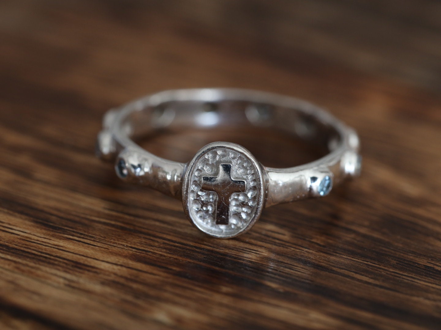 This rosary ring with cubic zirconium is rhodium plated so it doesn’t tarnish or change color. Stone on this rosary ring is cubic zirconium that can be in clear or light blue color.