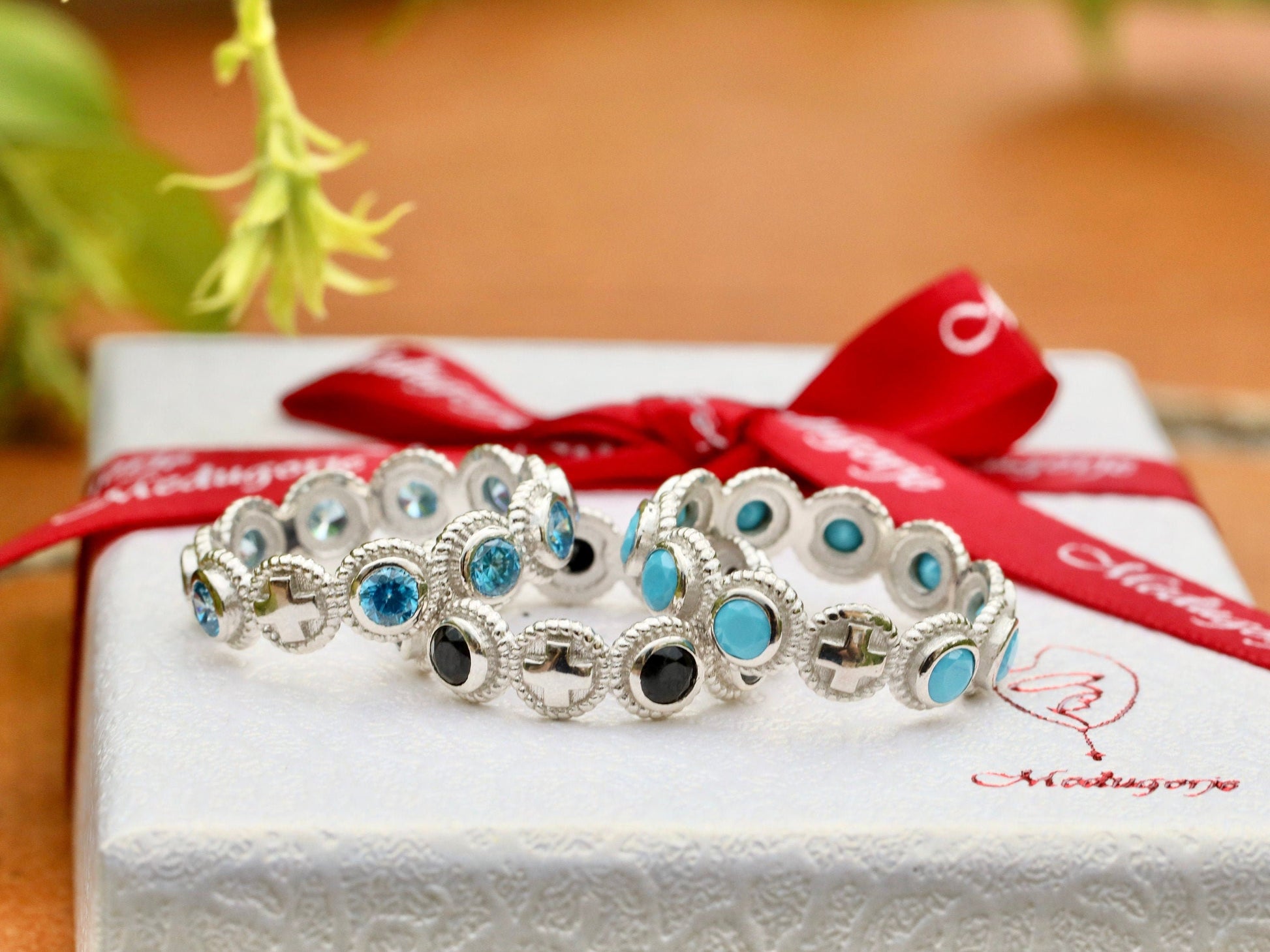This rosary ring is made with sterling silver and rhodium plating so it doesn’t tarnish or change colour.